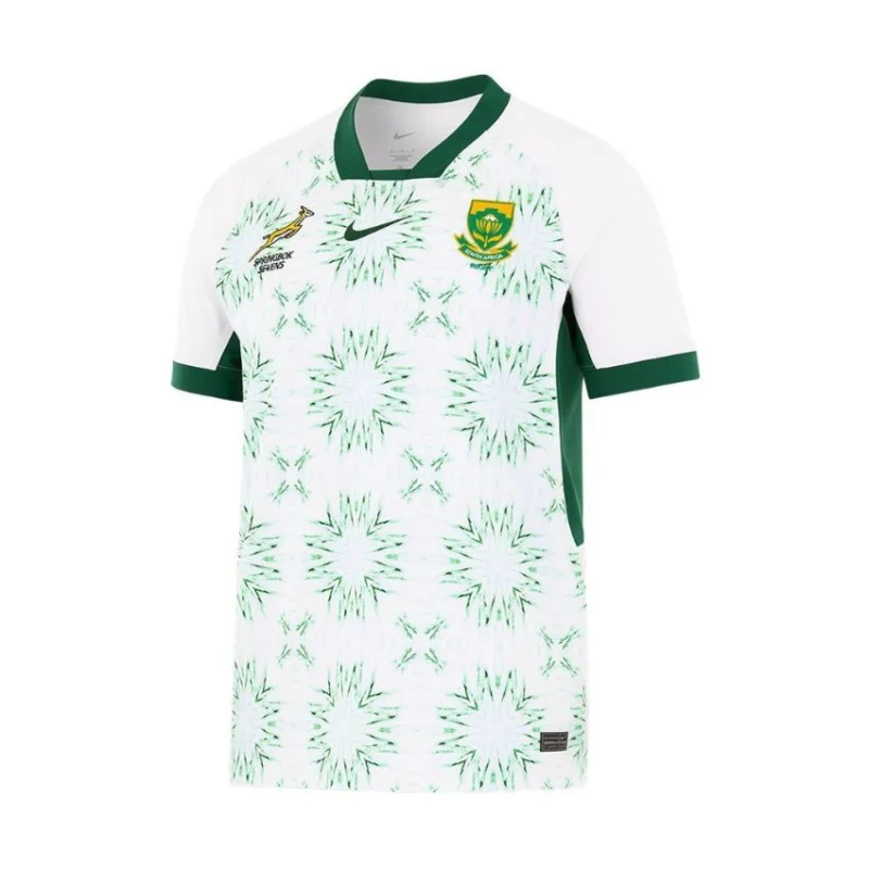 Tout blanc immaculé, col Protea en vert bouteille traditionnel, logos verts profonds et détails subtils qui rappellent la fierté nationale.Ce design épuré et intemporel rend hommage au King Protea (la fleur nationale) avec un col striking inspiré de ses feuilles, tout en intégrant les quatre étoiles des titres mondiaux dans les finitions intérieures.