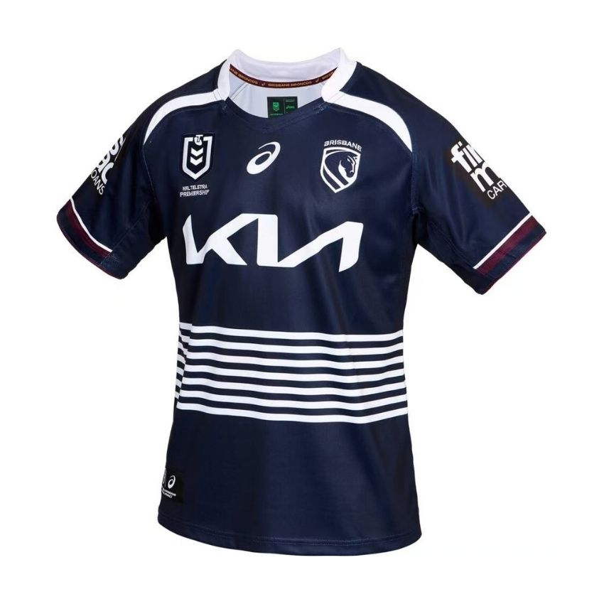Cette nouvelle saison, le maillot extérieur Brisbane Broncos 2026 arbore un bleu marine et des bandes blanches sur la largeur du corps.