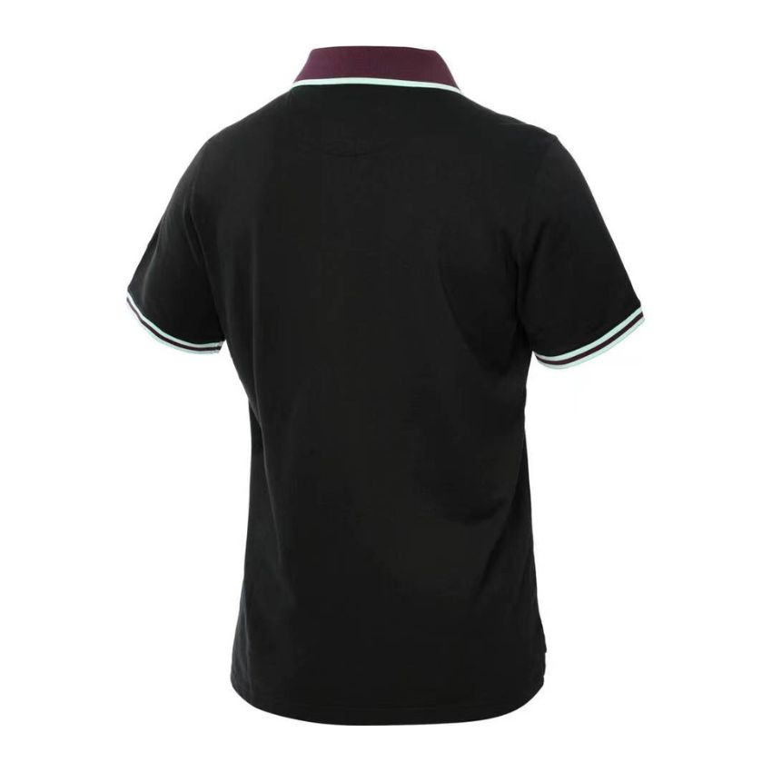 La base noire du polo est relevée par des passepoils discrets ton sur ton, une patte de boutonnage traditionnelle et un col en maille jacquard texturée.