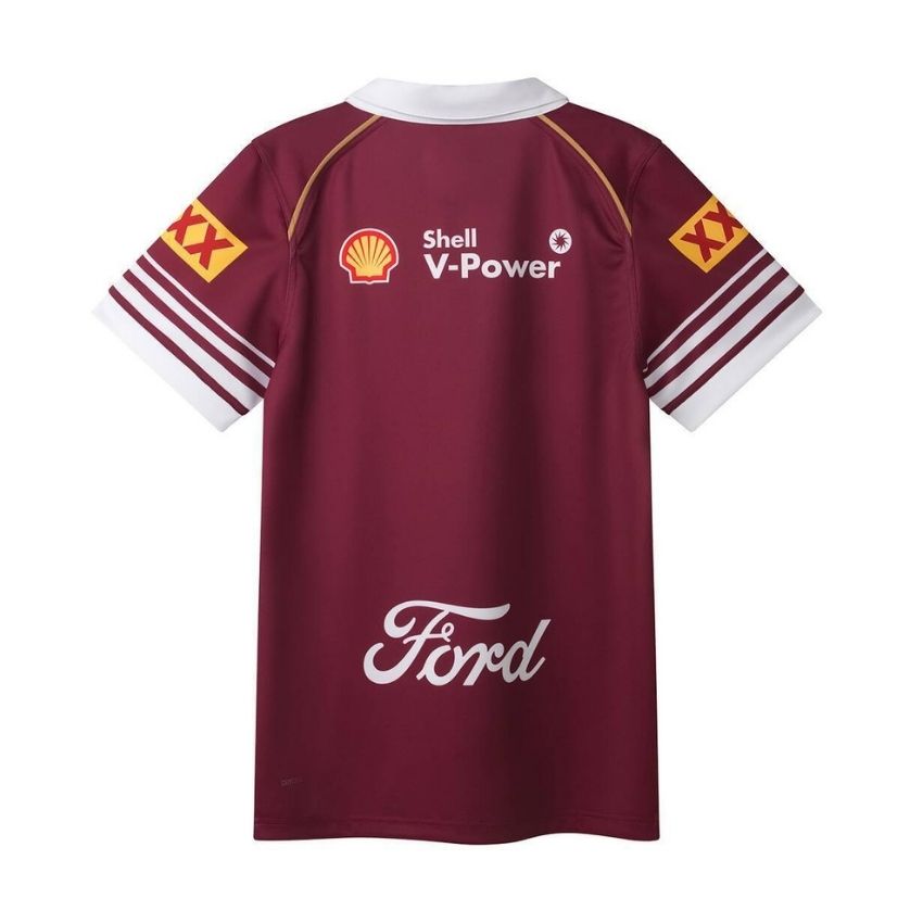 Logos et écusson brodés : Inclut l’écusson Queensland Maroons ainsi que les logos officiels des sponsors pour un style authentique et officiel.