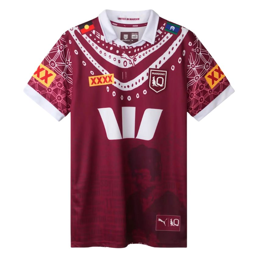 Ce modèle rend hommage aux Premières Nations du Queensland : les couleurs historiques des Maroons s’intègre dans une œuvre visuelle forte, conçue en collaboration avec un artiste autochtone local.