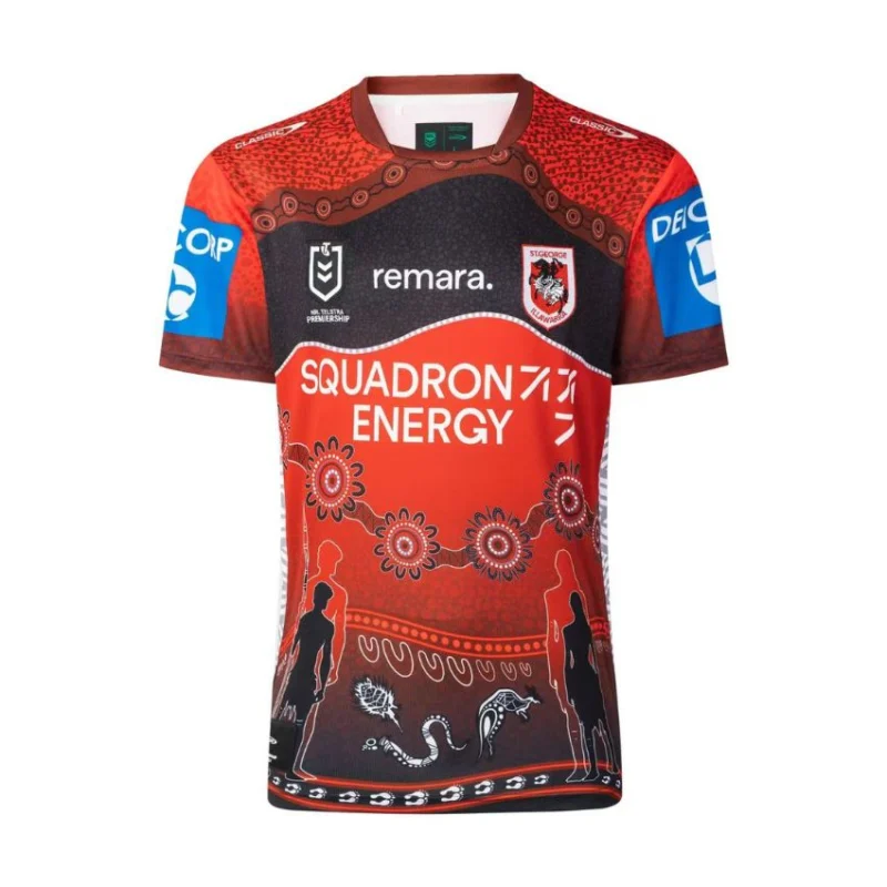 Ce modèle emblématique des Dragons est souvent porté pendant le très attendu Indigenous Round de la NRL.